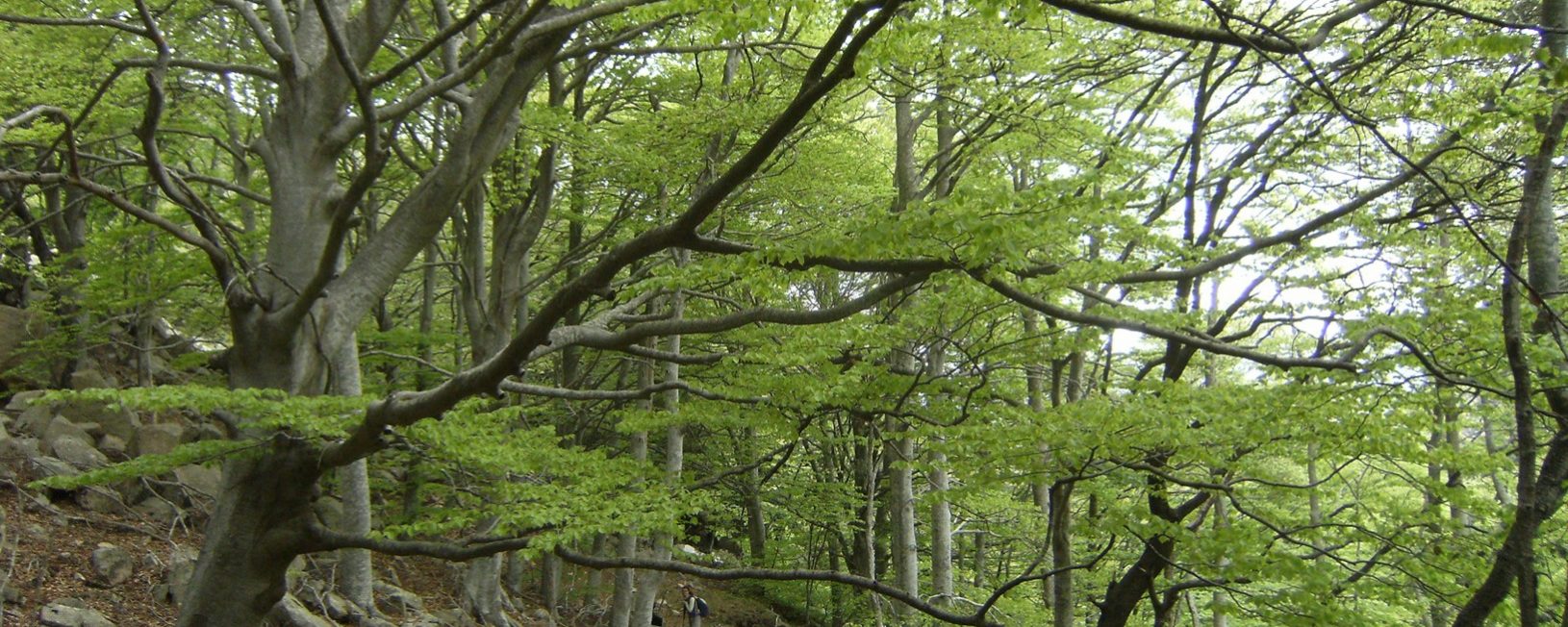 De repente y sin que lo hubiéramos previsto, un excelente hayedo surge ante nosotros y nos introducimos en él, lo cruzamos, entre arroyos y murmullos de agua de las regatas, entre laderas inclinadas a modo de anfiteatro de suelo limpio de vegetación típico de los hayedos viejos. Las hayas de más edad, sanas y verdes, tienen formas originales y distintas que forman con sus distintas ramas. Más abajo aparece algún viejo roble, y más abajo un bosquecillo muy frondoso de quercus, encinas. La senda no tiene pérdida alguna. No hay cruces y hay que seguirla dejando el fondo del valle a la derecha mientras bajamos. A veces nos acercamos al lecho del ruidoso Torrent dels Rentadors, que nos ofrece cascadas, amplios remansos entre grandes rocas y una visión agradable de vida y agua. Verdaderamente nos hemos sorprendido por el descubrimiento del lugar, con sus hayedos y robledales impresionantes y casi perdidos e invisibles, fuera de las rutas habituales del Montseny. Y solamente cruzados por esta estrecha pero cuidada senda. Impresionante y excepcional. Yo alardeo con mis compañeros “¡Vaya sitios a los que os traigo!”, pero realmente, ni yo mismo sabía que me iba a encontrar tanta belleza en esta senda perdida, escondida, “desconocida” de bajada. Alucinamos.